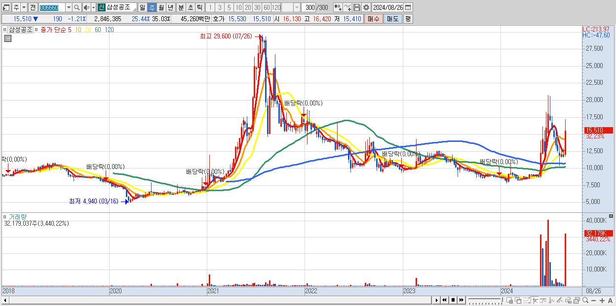 - 삼성공조 (15,510원 ▲ 32.23% , 시총: 1,260억, 거래량: 32,179,037, 거래대금:4,931억)