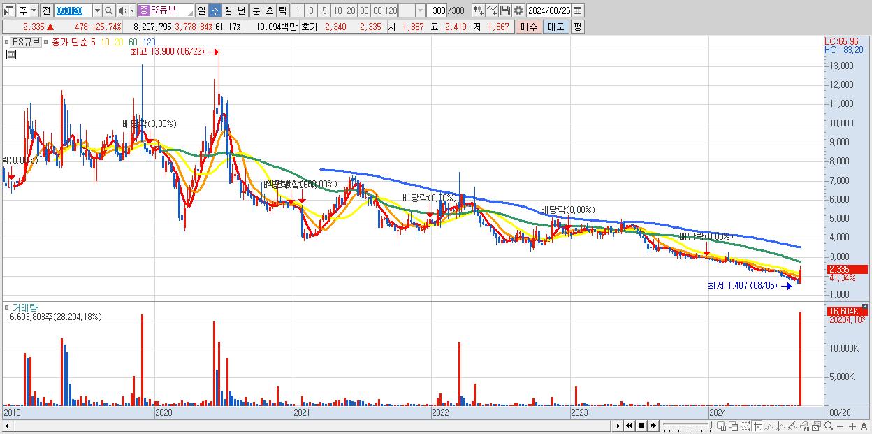 - ES큐브 (2,335원 ▲ 41.34% , 시총: 317억, 거래량: 16,603,803, 거래대금:375억)