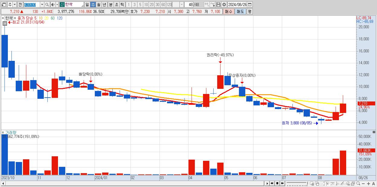 - 한싹 (7,210원 ▲ 24.96% , 시총: 786억, 거래량: 31,662,774, 거래대금:2,330억)
