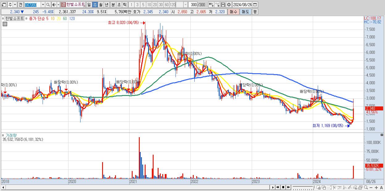 - 한빛소프트 (2,340원 ▲ 43.56% , 시총: 581억, 거래량: 35,532,158, 거래대금:961억)