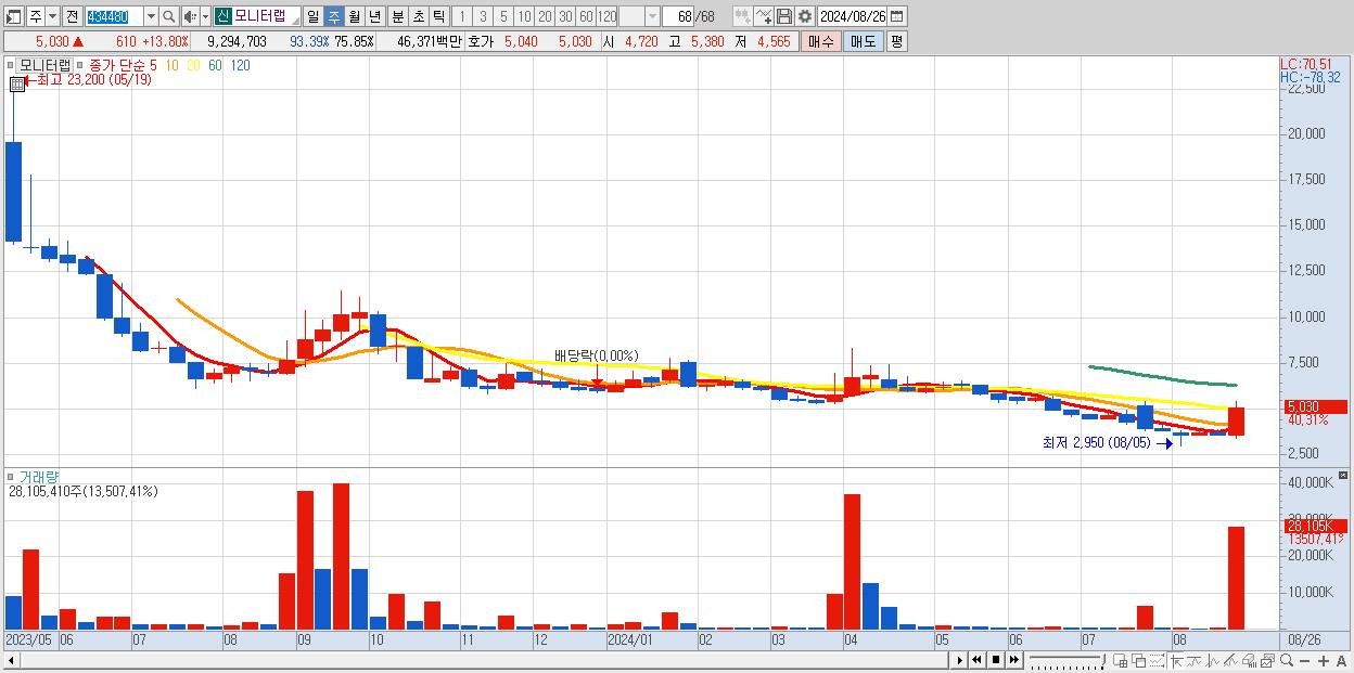 - 모니터랩 (5,030원 ▲ 40.31% , 시총: 616억, 거래량: 28,105,410, 거래대금:1,350억)