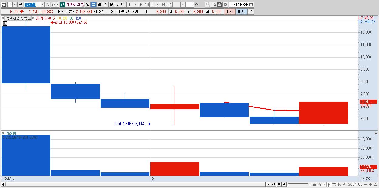 - 엑셀세라퓨틱스 (6,390원 ▲ 38.46% , 시총: 698억, 거래량: 9,392,267, 거래대금:536억)