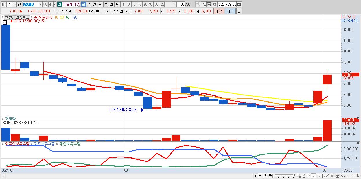 - 엑셀세라퓨틱스 (7,850원 ▲ 22.85% , 시총: 857억, 거래량: 33,039,424, 거래대금:2,528억)