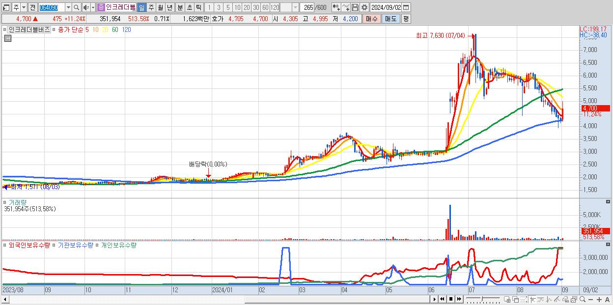 - 인크레더블버즈 (4,700원 ▲ 11.24% , 시총: 2,338억, 거래량: 351,954, 거래대금:16억)