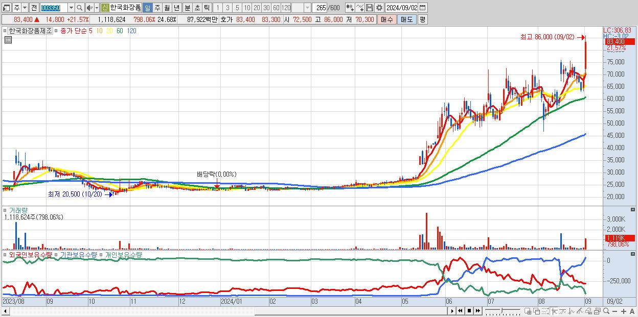- 한국화장품제조 (83,400원 ▲ 21.57% , 시총: 3,780억, 거래량: 1,118,624, 거래대금:879억)