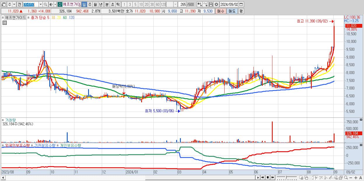- 에프앤가이드 (11,020원 ▲ 14.08% , 시총: 1,251억, 거래량: 326,184, 거래대금:35억)