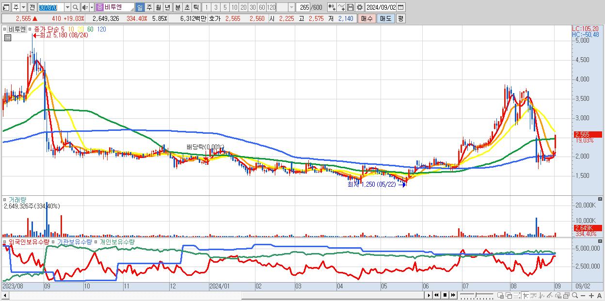 - 비투엔 (2,565원 ▲ 19.03% , 시총: 1,162억, 거래량: 2,649,326, 거래대금:63억)