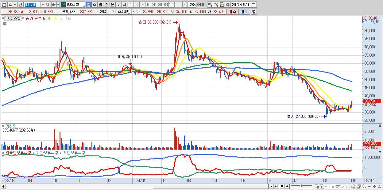 - TCC스틸 (36,850원 ▲ 10.83% , 시총: 9,660억, 거래량: 599,466, 거래대금:214억)