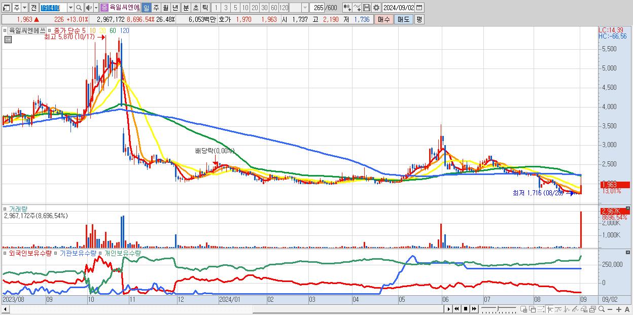 - 육일씨엔에쓰 (1,963원 ▲ 13.01% , 시총: 220억, 거래량: 2,967,172, 거래대금:61억)
