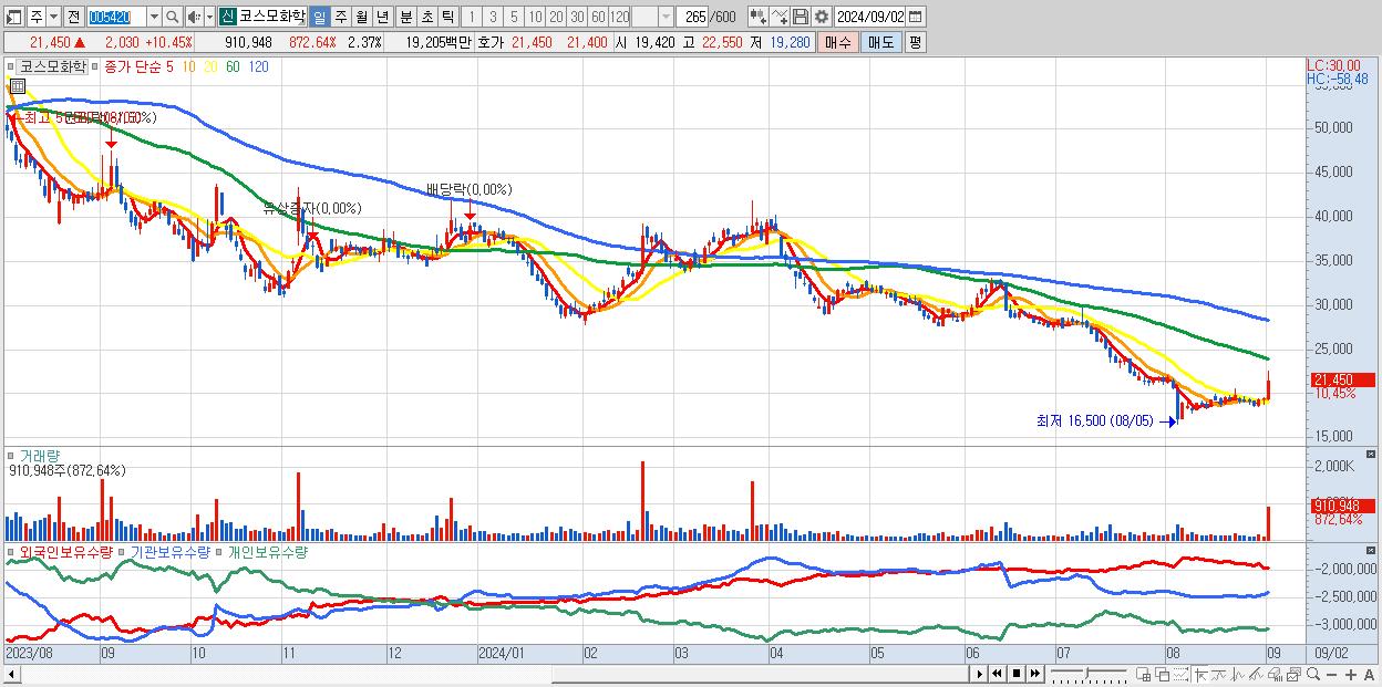 - 코스모화학 (21,450원 ▲ 10.45% , 시총: 8,239억, 거래량: 910,948, 거래대금:192억)