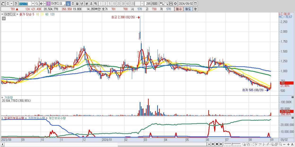 - 아센디오 (701원 ▲ 21.49% , 시총: 726억, 거래량: 20,504,778, 거래대금:144억)