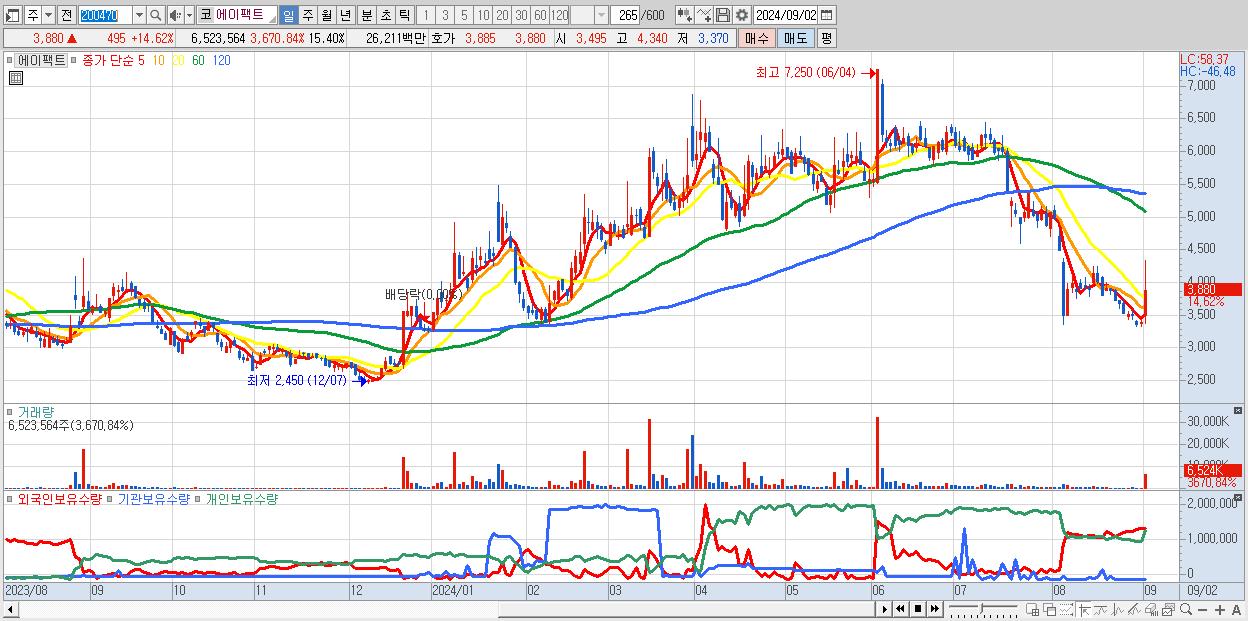 - 에이팩트 (3,880원 ▲ 14.62% , 시총: 1,644억, 거래량: 6,523,564, 거래대금:262억)