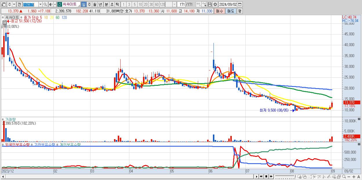 - 씨싸이트 (13,370원 ▲ 17.18% , 시총: 780억, 거래량: 2,399,578, 거래대금:319억)