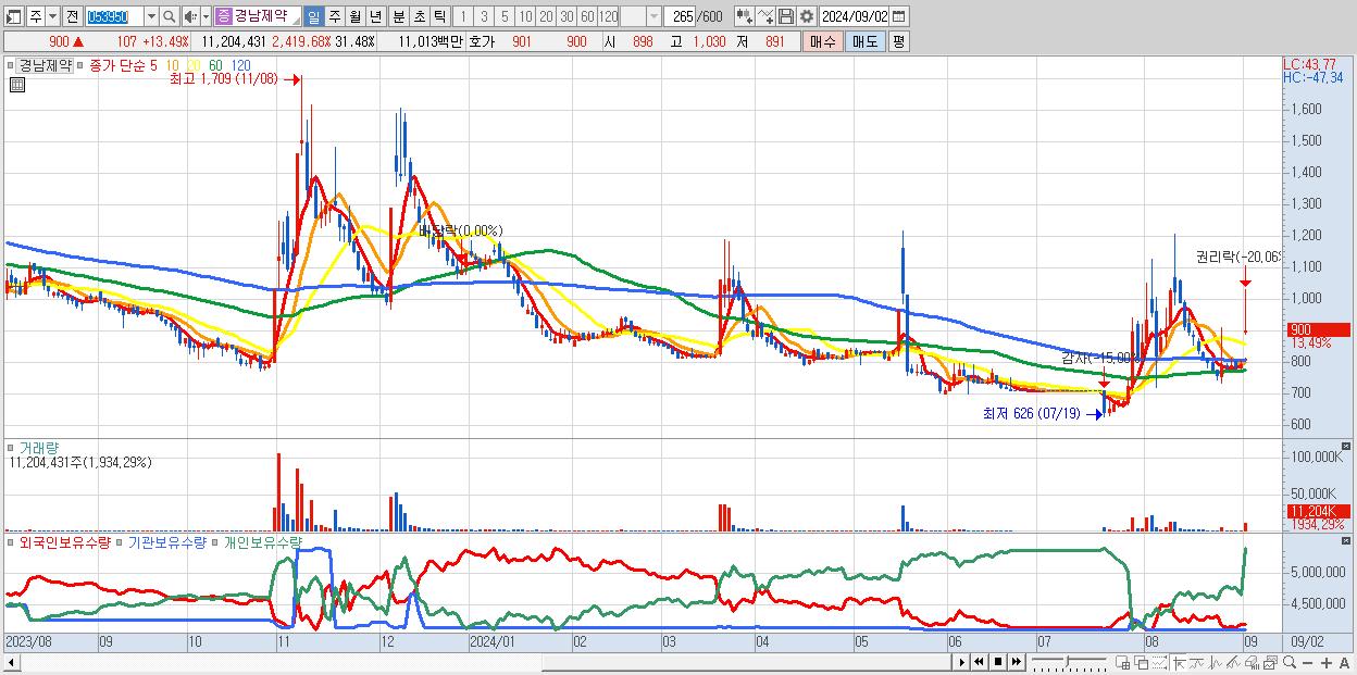- 경남제약 (900원 ▲ 13.49% , 시총: 320억, 거래량: 11,204,431, 거래대금:110억)