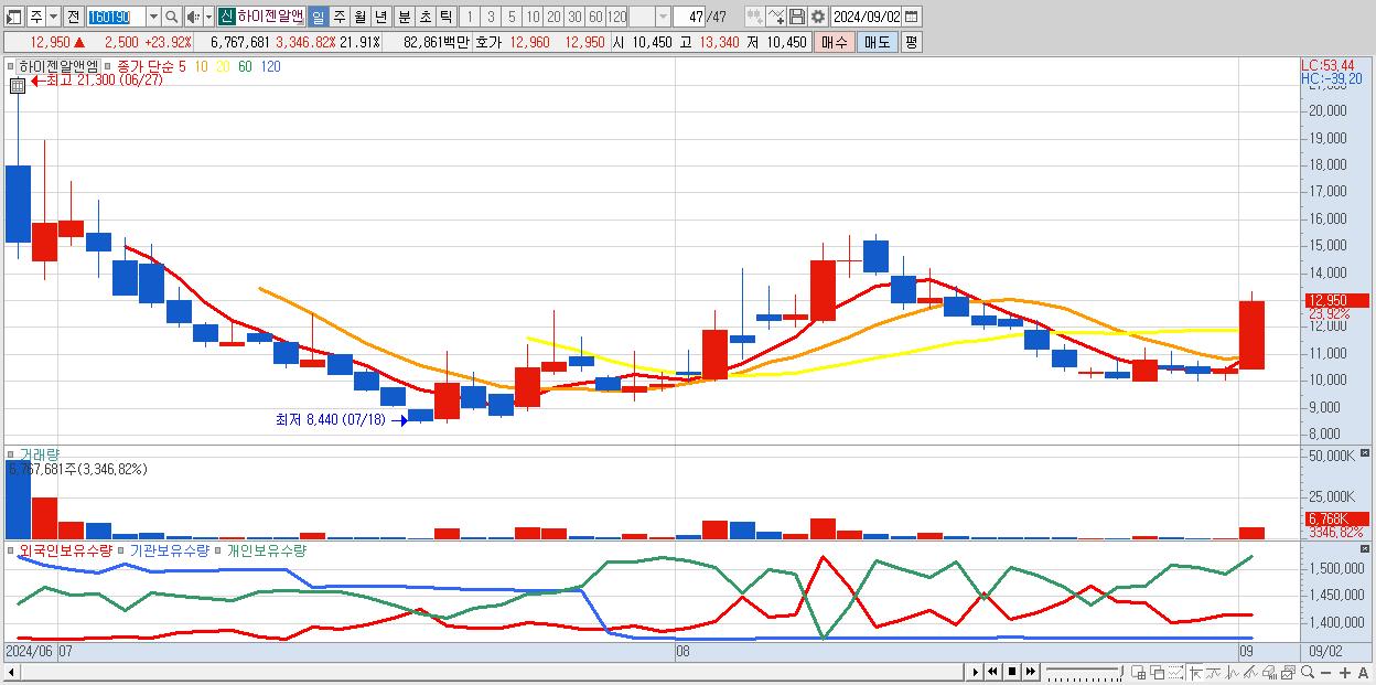 - 하이젠알앤엠 (12,950원 ▲ 23.92% , 시총: 4,000억, 거래량: 6,767,681, 거래대금:829억)