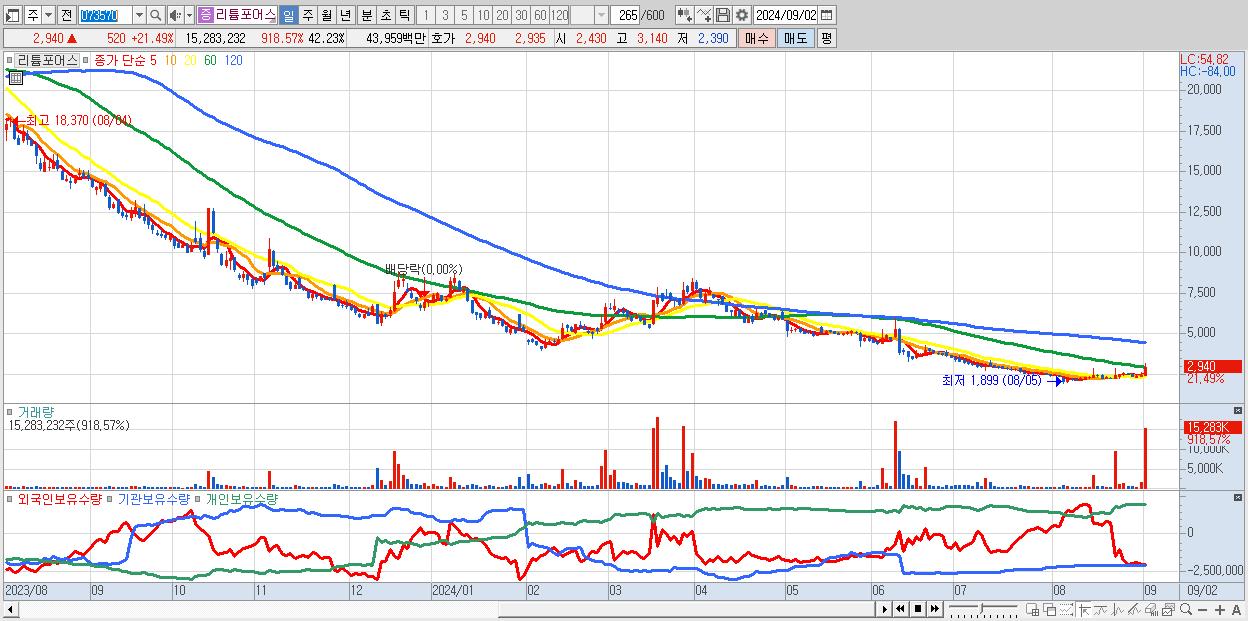 - 리튬포어스 (2,940원 ▲ 21.49% , 시총: 1,064억, 거래량: 15,283,232, 거래대금:440억)