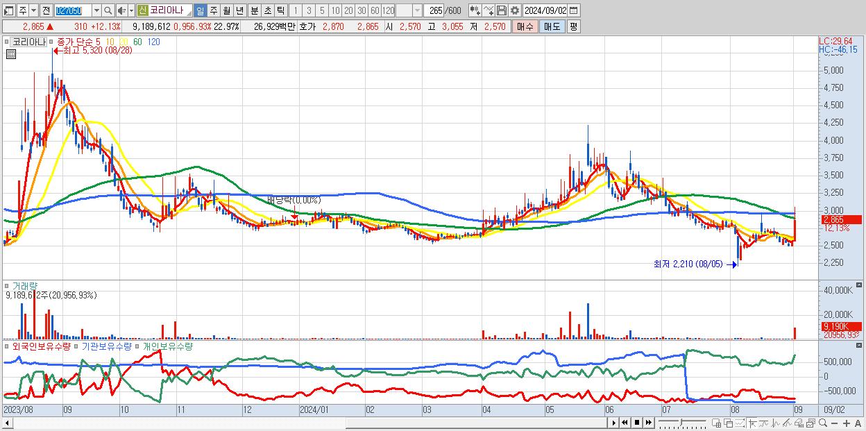- 코리아나 (2,865원 ▲ 12.13% , 시총: 1,146억, 거래량: 9,189,612, 거래대금:269억)