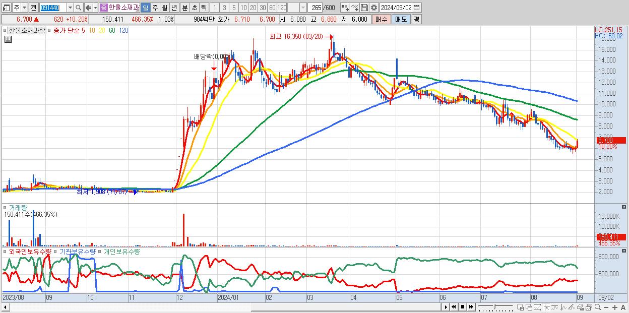 - 한울소재과학 (6,700원 ▲ 10.2% , 시총: 979억, 거래량: 150,411, 거래대금:10억)