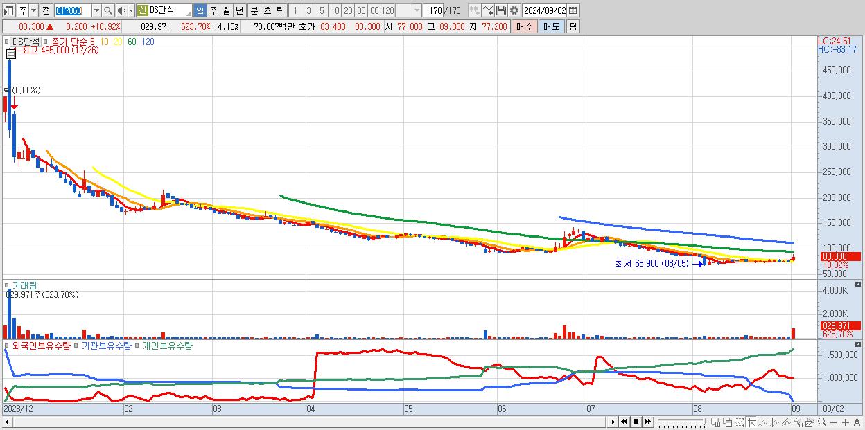 - DS단석 (83,300원 ▲ 10.92% , 시총: 4,883억, 거래량: 829,971, 거래대금:701억)