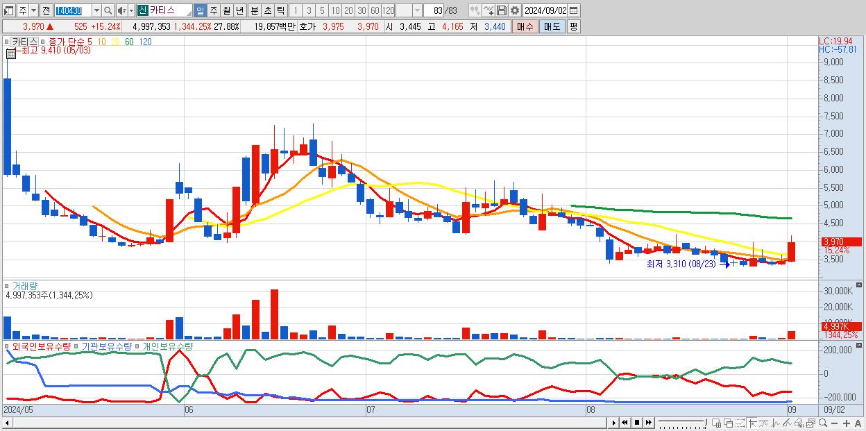 - 카티스 (3,970원 ▲ 15.24% , 시총: 712억, 거래량: 4,997,353, 거래대금:199억)