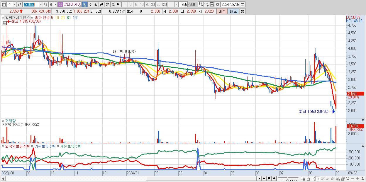 - 압타머사이언스 (2,550원 ▲ 29.84% , 시총: 433억, 거래량: 3,678,032, 거래대금:90억)