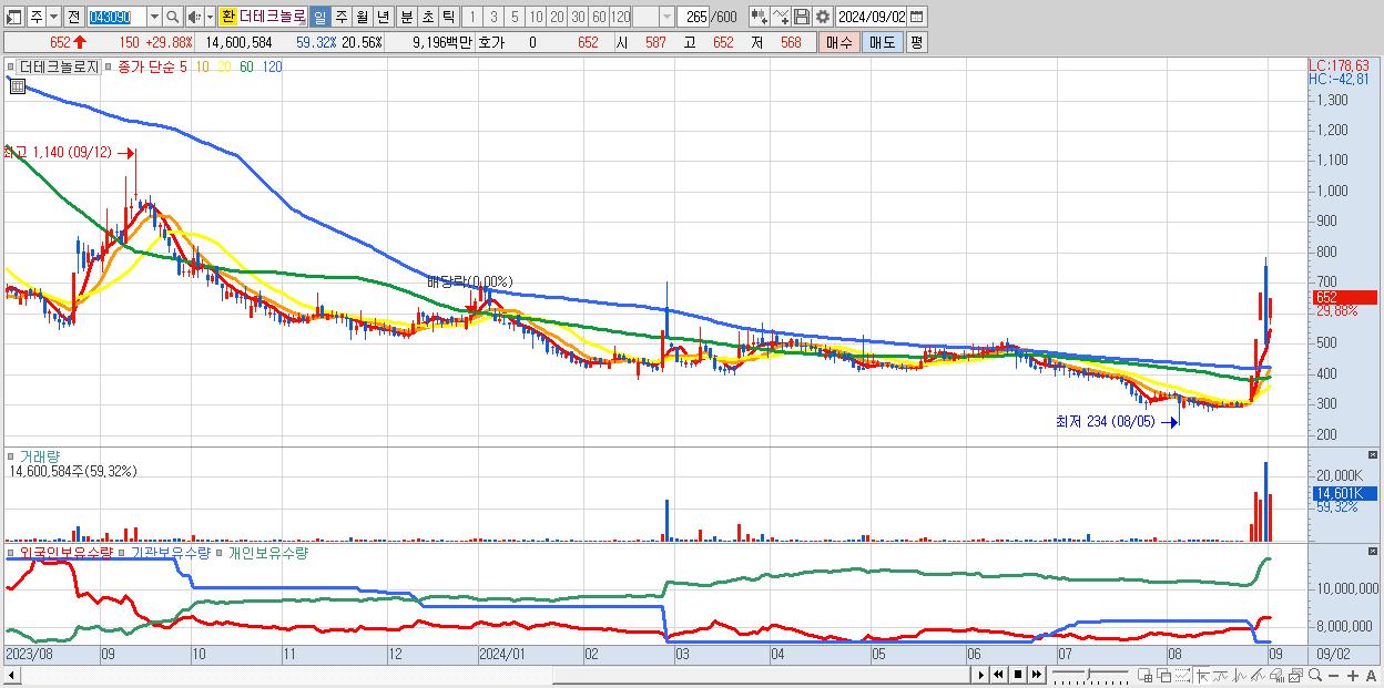 - 더테크놀로지 (652원 ▲ 29.88% , 시총: 463억, 거래량: 14,600,584, 거래대금:92억)