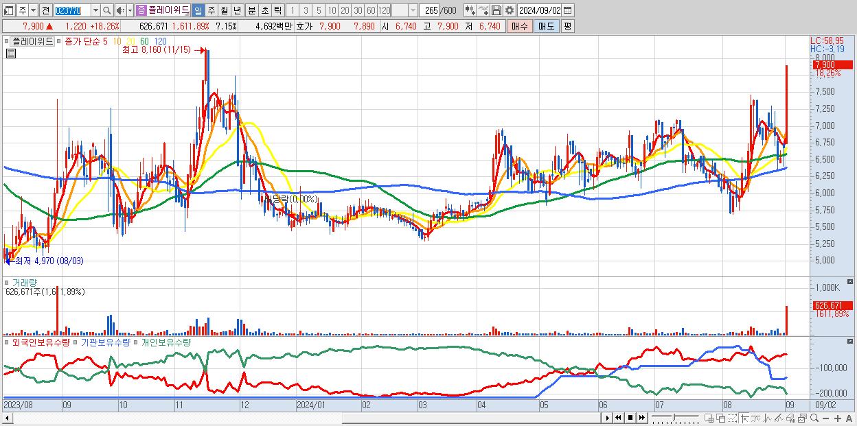 - 플레이위드 (7,900원 ▲ 18.26% , 시총: 693억, 거래량: 626,671, 거래대금:47억)