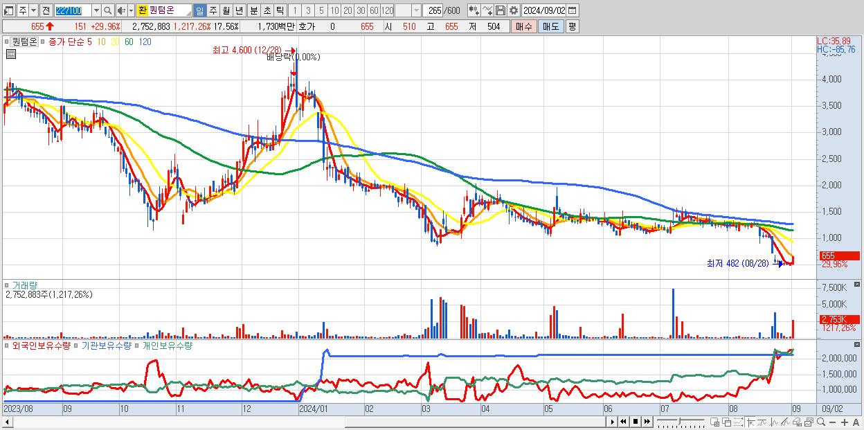 - 퀀텀온 (655원 ▲ 29.96% , 시총: 103억, 거래량: 2,752,883, 거래대금:17억)