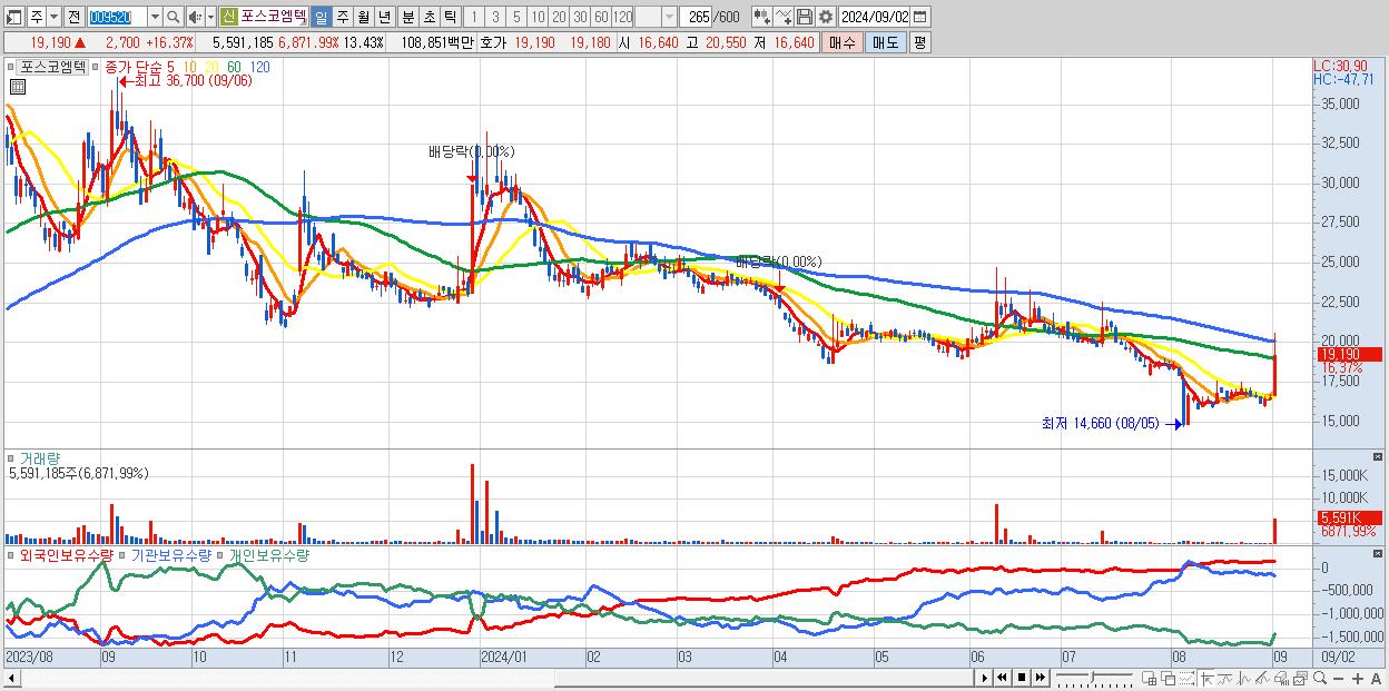- 포스코퓨처엠 (246,500원 ▲ 14.92% , 시총: 190,947억, 거래량: 1,383,756, 거래대금:3,315억)