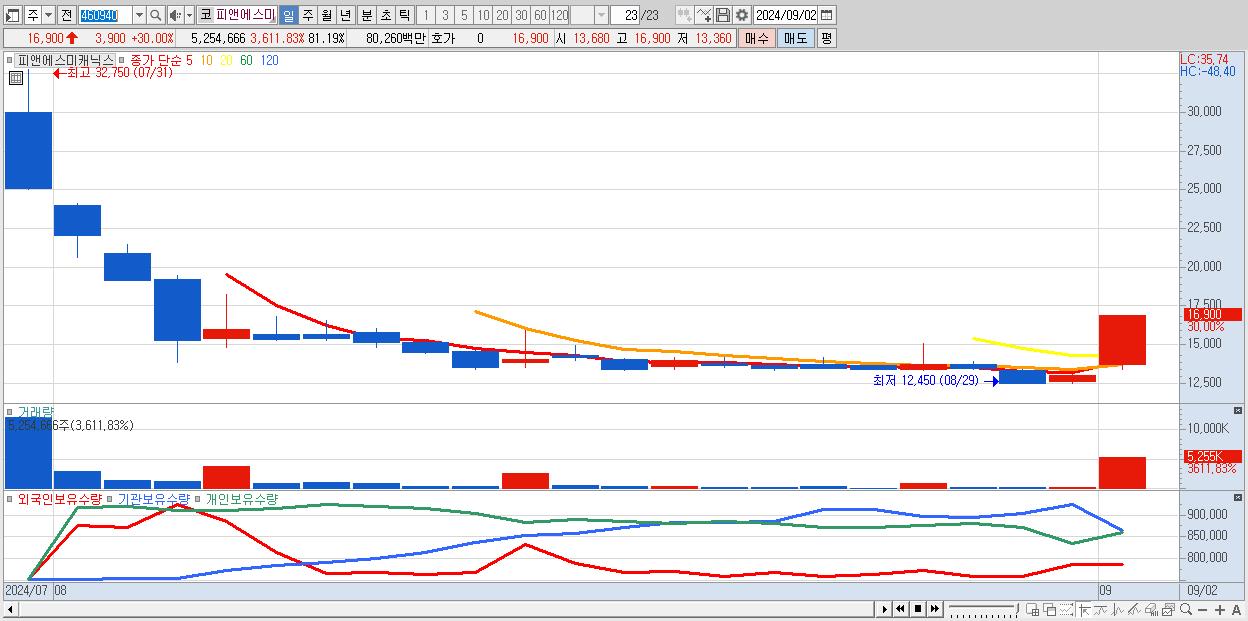 - 피앤에스미캐닉스 (16,900원 ▲ 30% , 시총: 1,094억, 거래량: 5,254,666, 거래대금:803억)