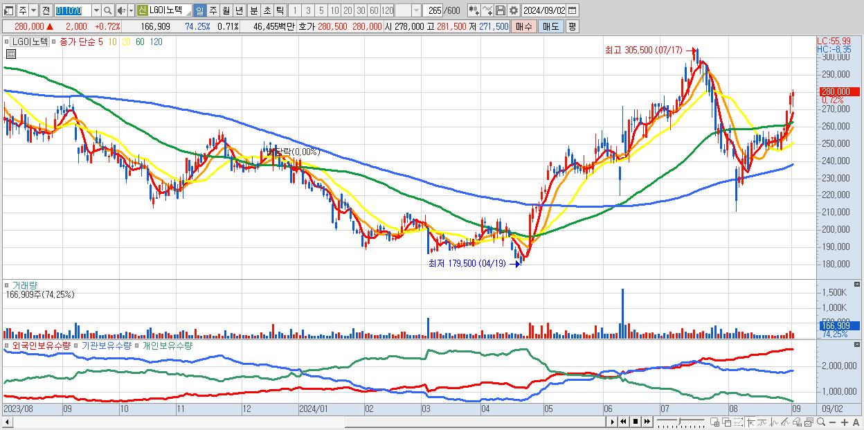 - LG이노텍 (280,000원 ▲ 0.72% , 시총: 66,268억, 외국인 순매수 거래금:65억)