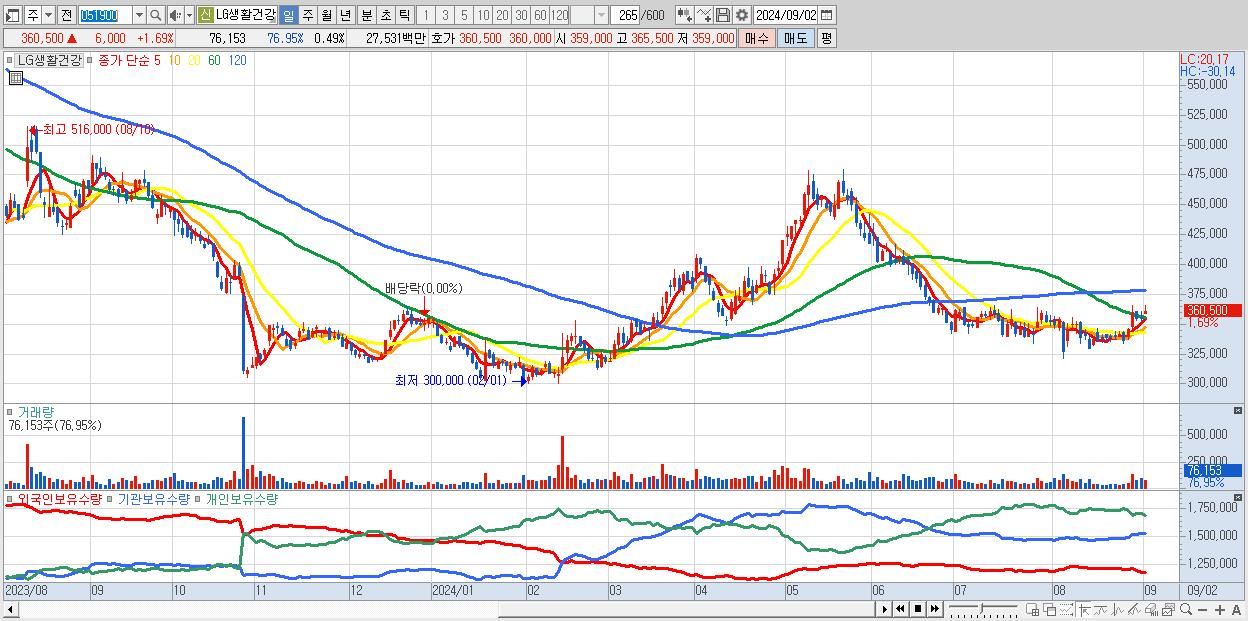 - LG생활건강 (360,500원 ▲ 1.69% , 시총: 56,304억, 외국인 순매수 거래금:82억)