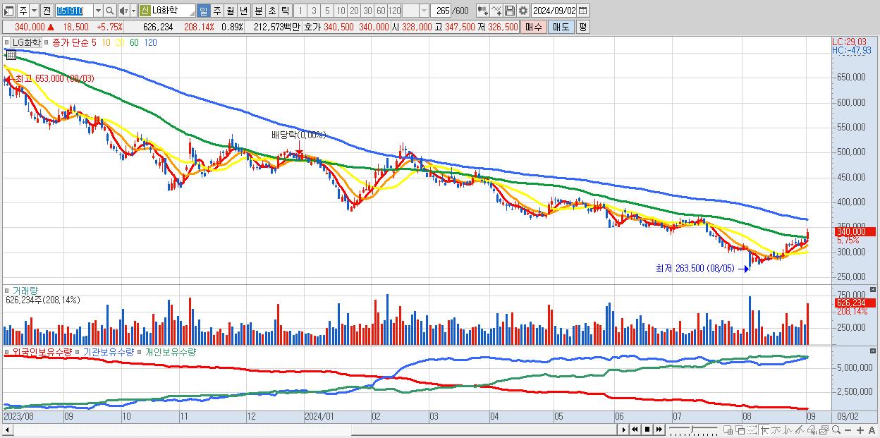 - LG화학 (340,000원 ▲ 5.75% , 시총: 240,014억, 외국인 순매수 거래금:366억)