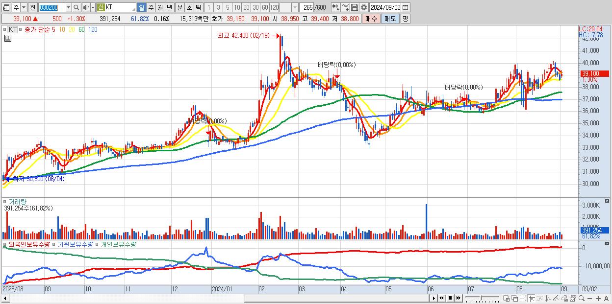 - KT (39,100원 ▲ 1.3% , 시총: 98,540억, 외국인 순매수 거래금:45억)