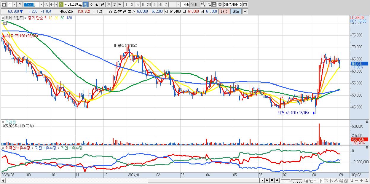 - 씨에스윈드 (63,200원 ▼ -1.86% , 시총: 26,652억, 외국인 순매수 거래금:43억)