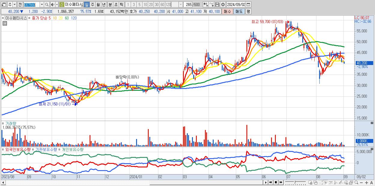 - 이수페타시스 (40,200원 ▼ -2.9% , 시총: 25,425억, 외국인 순매수 거래금:59억)