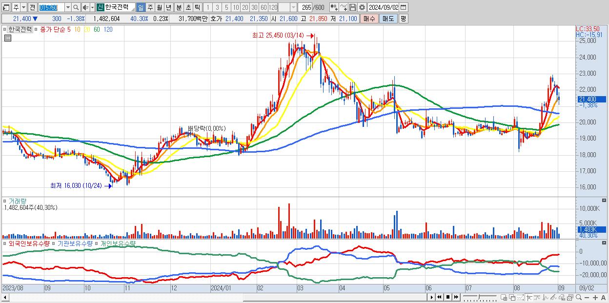 - 한국전력 (21,400원 ▼ -1.38% , 시총: 137,380억, 외국인 순매수 거래금:45억)