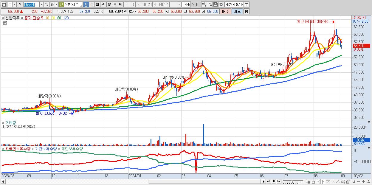 - 신한지주 (56,300원 ▲ 0.36% , 시총: 286,788억, 외국인 순매수 거래금:104억)