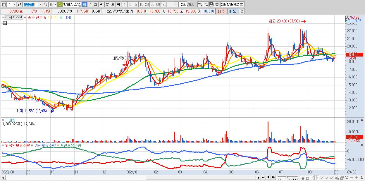 - 한화시스템 (18,900원 ▲ 1.45% , 시총: 35,706억, 외국인 순매수 거래금:44억)