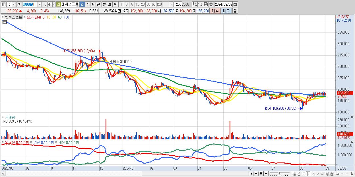 - 엔씨소프트 (192,200원 ▲ 2.45% , 시총: 42,196억, 외국인 순매수 거래금:44억)