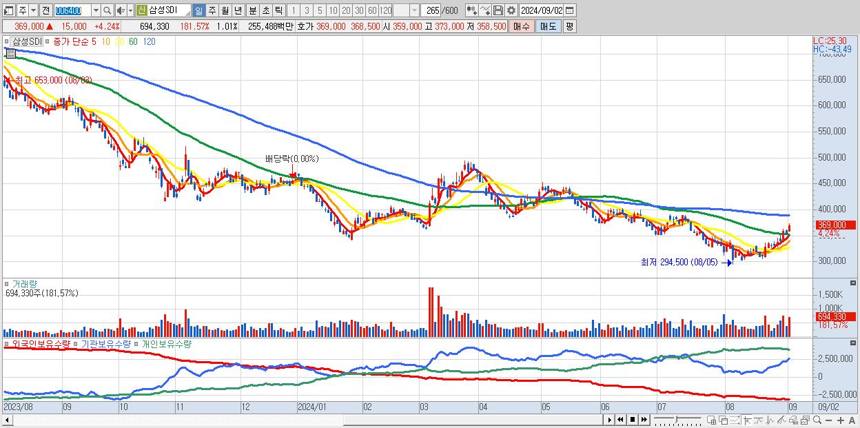 - 삼성SDI (369,000원 ▲ 4.24% , 시총: 253,741억, 외국인 순매수 거래금:282억)