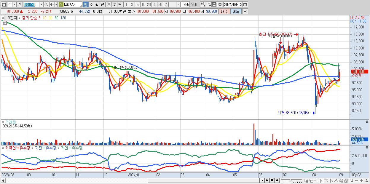 - LG전자 (101,600원 ▲ 2.21% , 시총: 166,266억, 외국인 순매수 거래금:124억)
