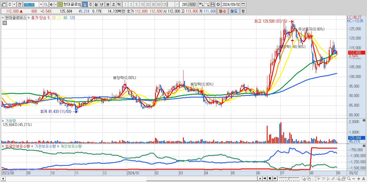 - 현대글로비스 (112,600원 ▲ 0.54% , 시총: 84,450억, 외국인 순매수 거래금:64억)