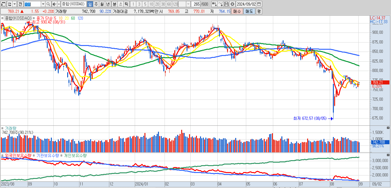 | 09/02 | 769.21 | ▲0.20% | 1,205억 | -545억 | -550억 | -110억 |