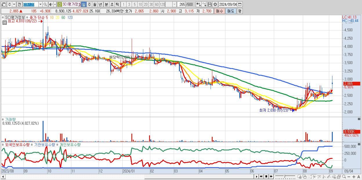 - SCI평가정보 (2,865원 ▲ 6.9% , 시총: 1,017억, 거래량: 8,930,125, 거래대금:263억)