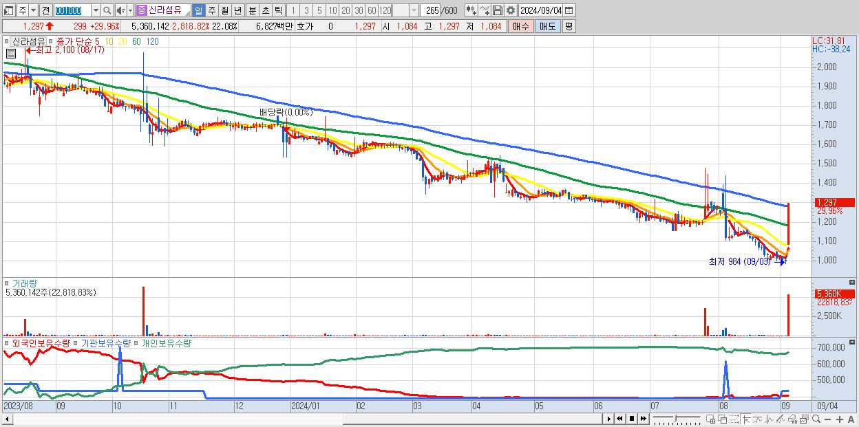 - 신라섬유 (1,297원 ▲ 29.96% , 시총: 315억, 거래량: 5,360,142, 거래대금:68억)