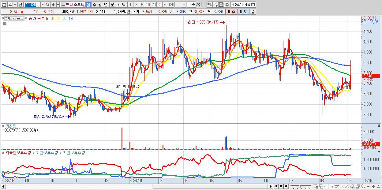 - 핸디소프트 (3,540원 ▲ 5.99% , 시총: 687억, 거래량: 408,879, 거래대금:15억)