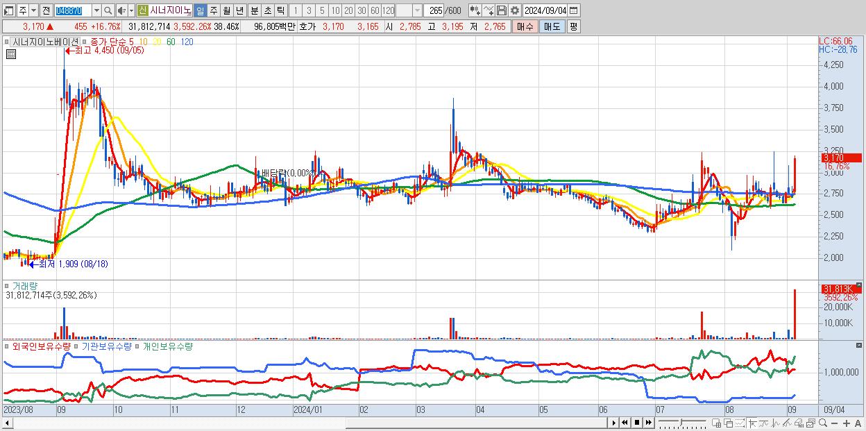 - 시너지이노베이션 (3,170원 ▲ 16.76% , 시총: 2,622억, 거래량: 31,812,714, 거래대금:968억)