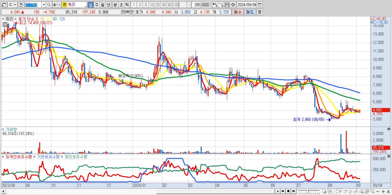 - 캐리 (4,045원 ▲ 4.79% , 시총: 295억, 거래량: 65,318, 거래대금:3억)