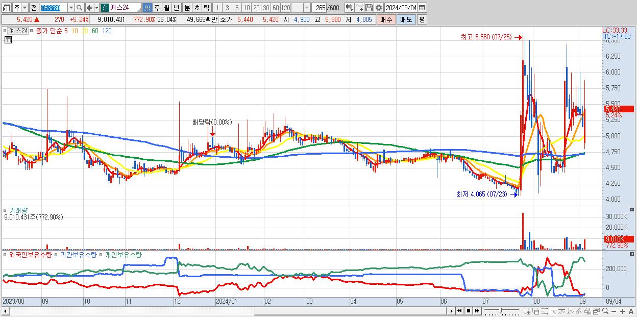 - 예스24 (5,420원 ▲ 5.24% , 시총: 1,355억, 거래량: 9,010,431, 거래대금:497억)